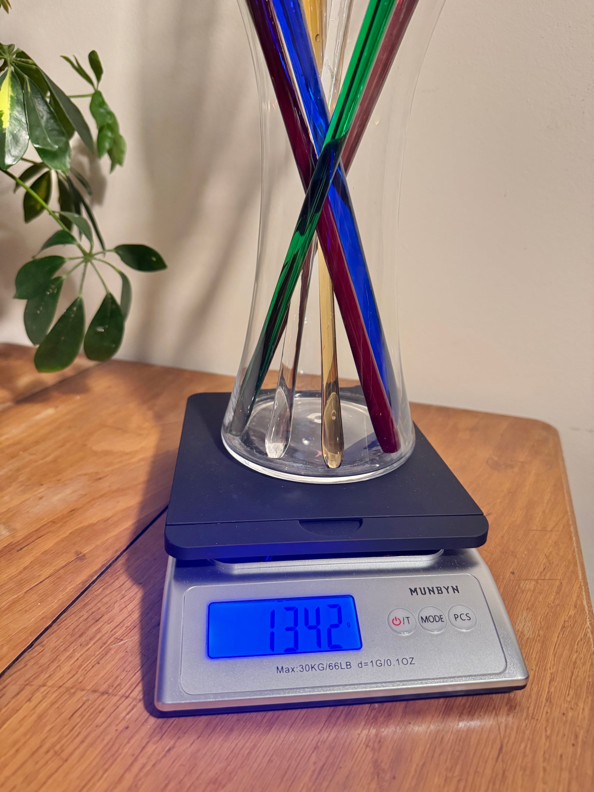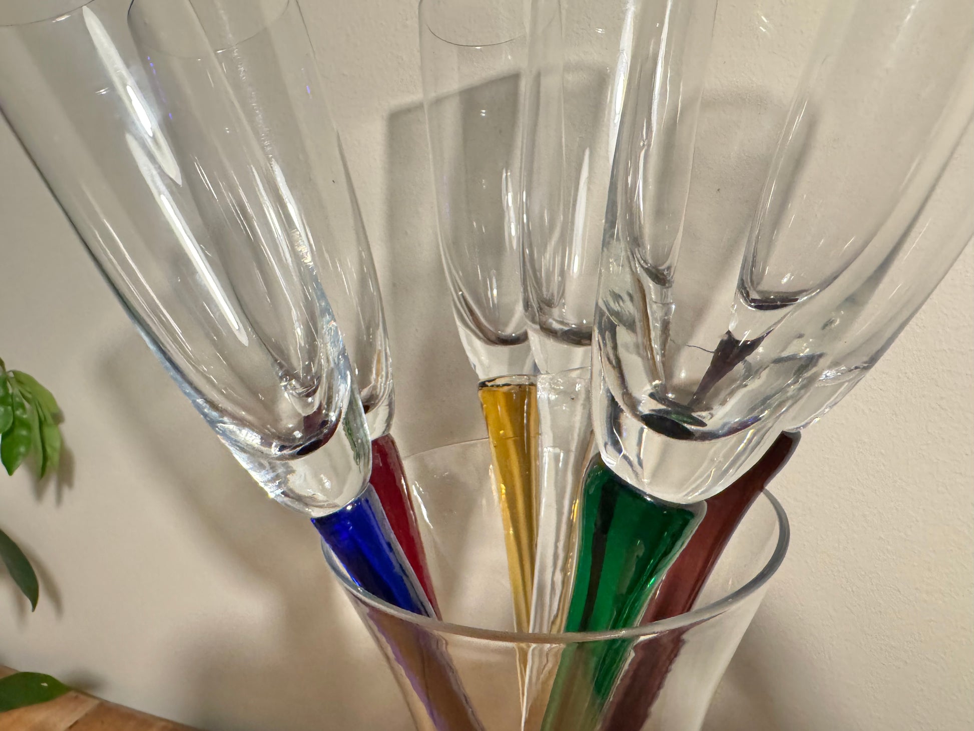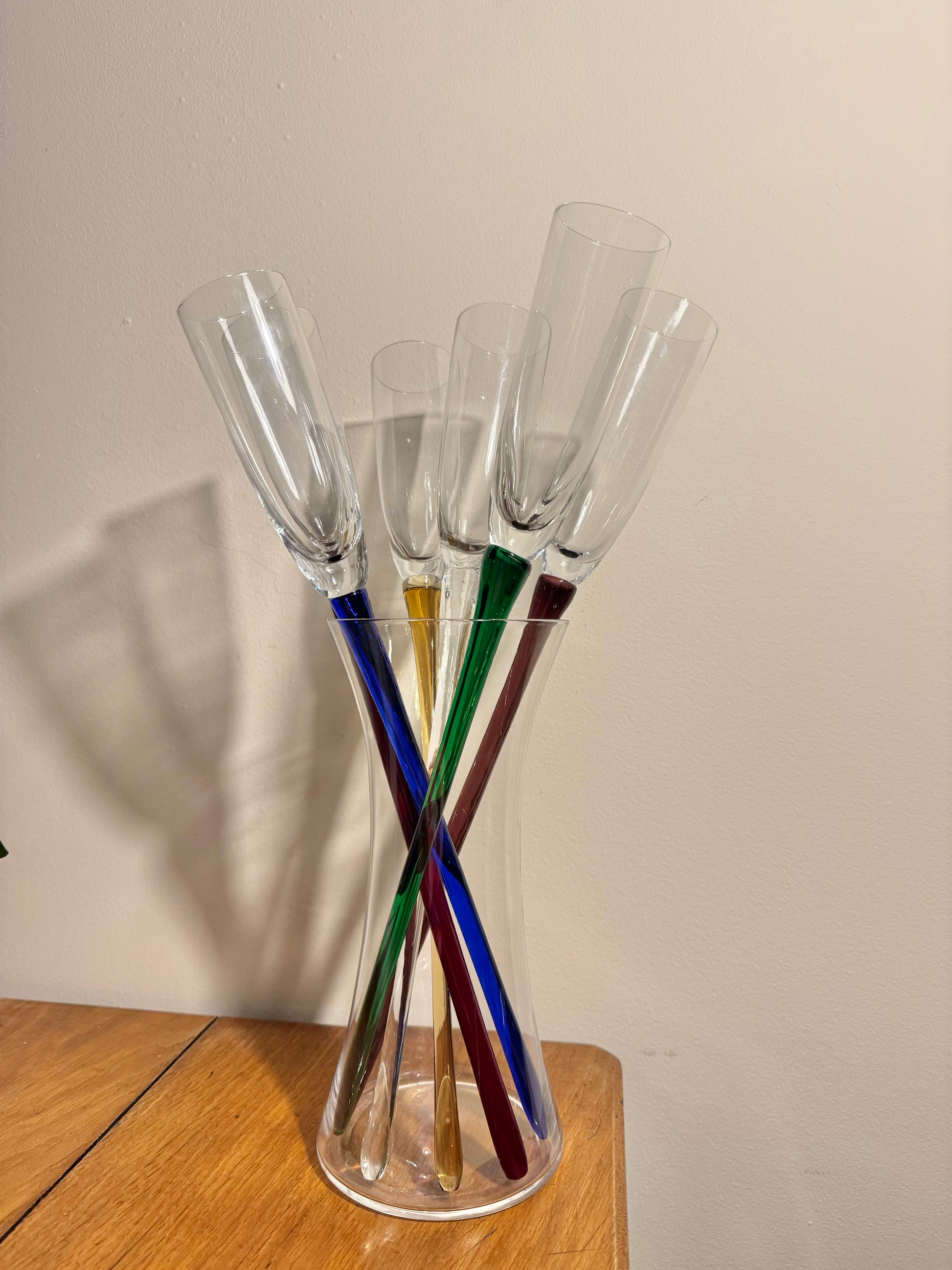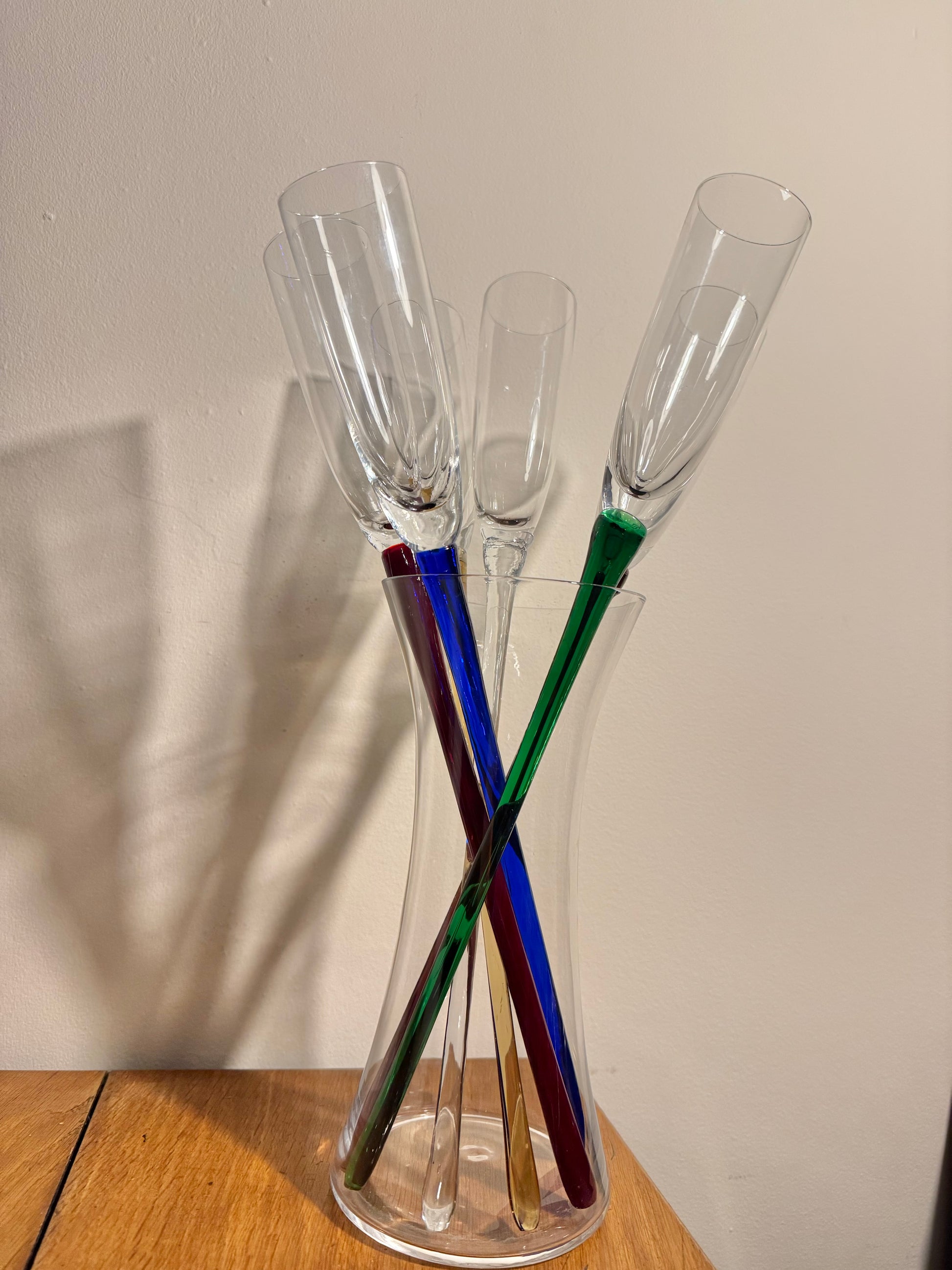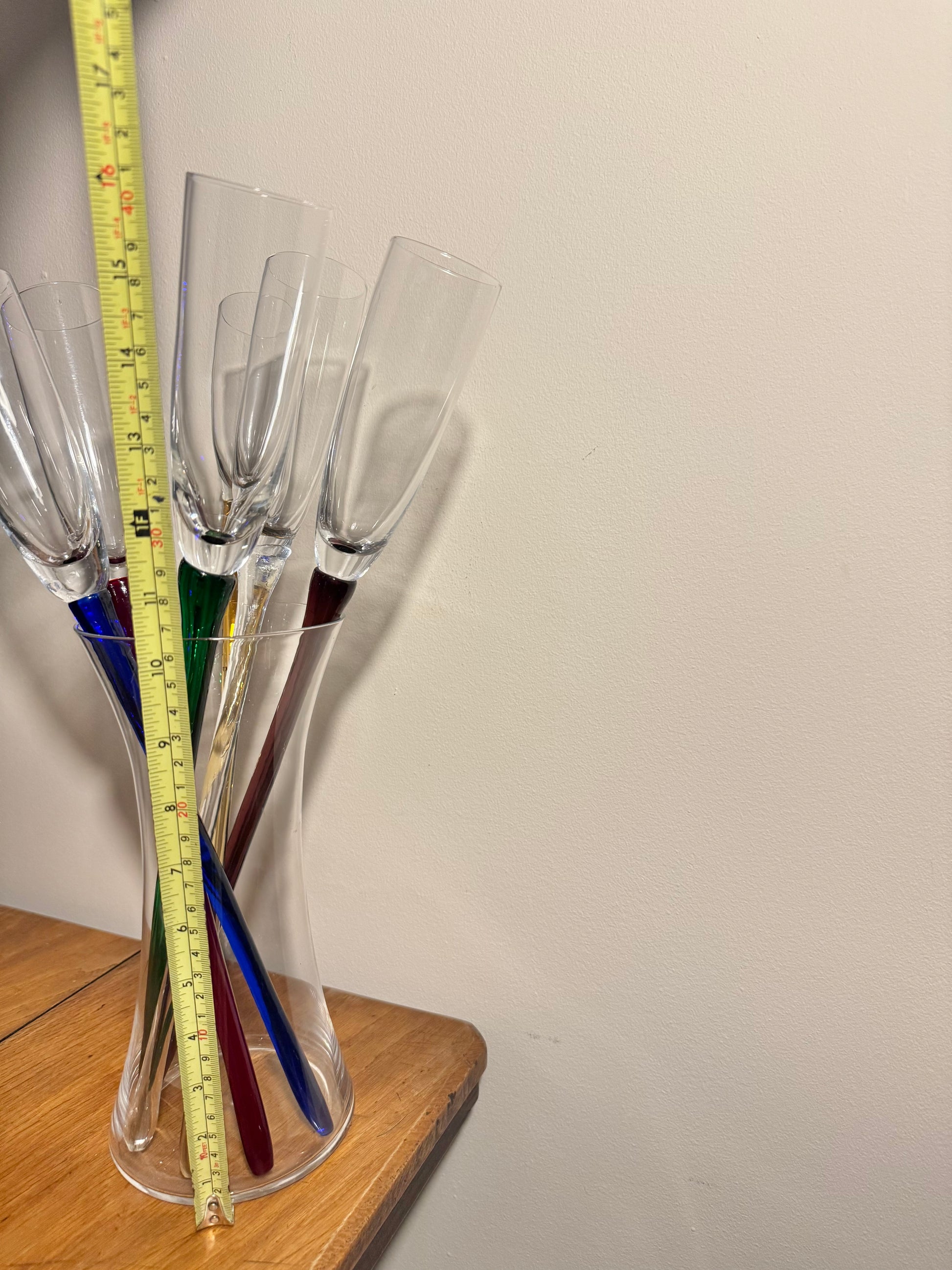 A gorgeous set of stemless flutes with a vase holder. In excellent condition. May show wear, please refer to photos. Measurements shown in photos also.