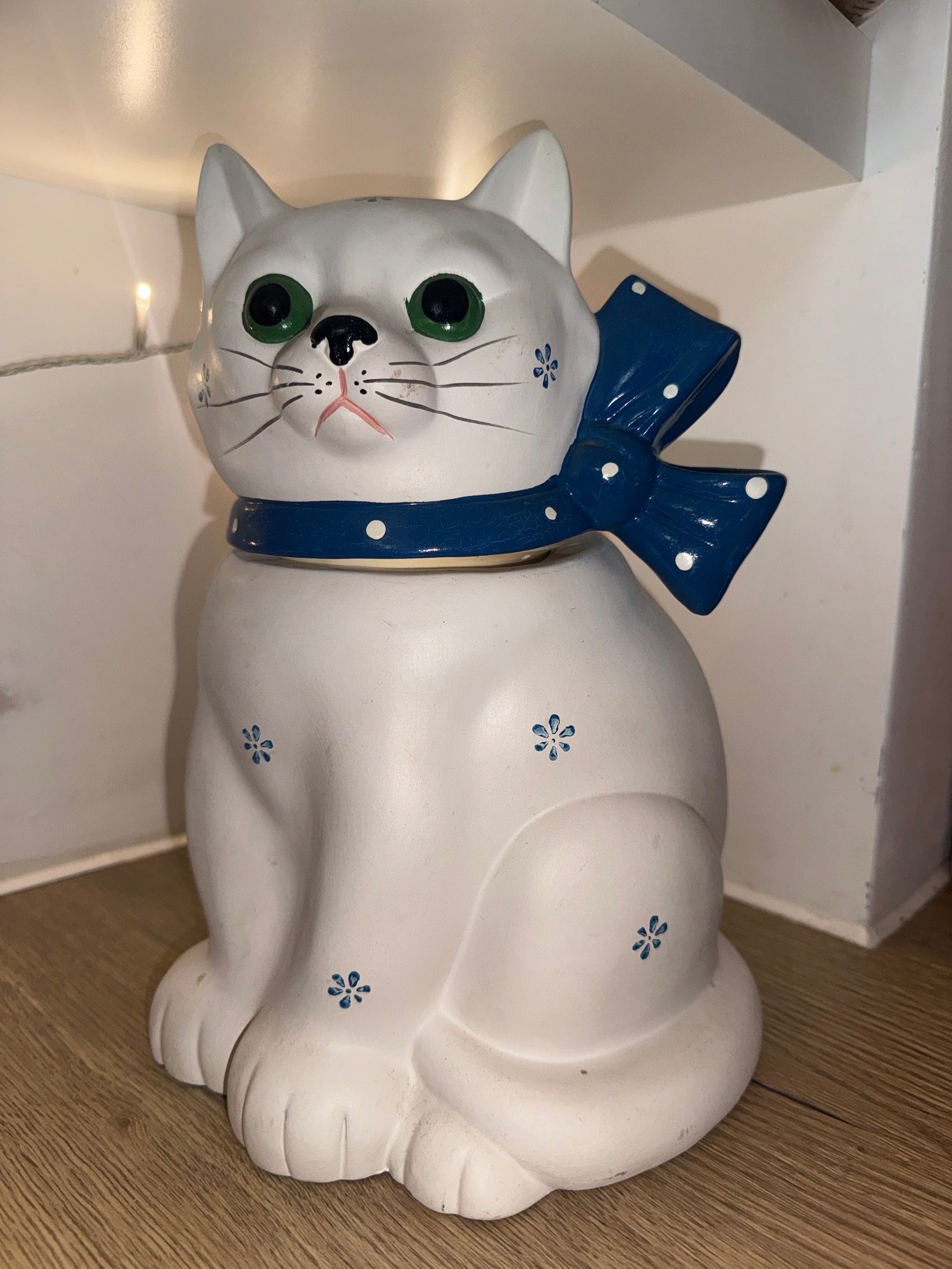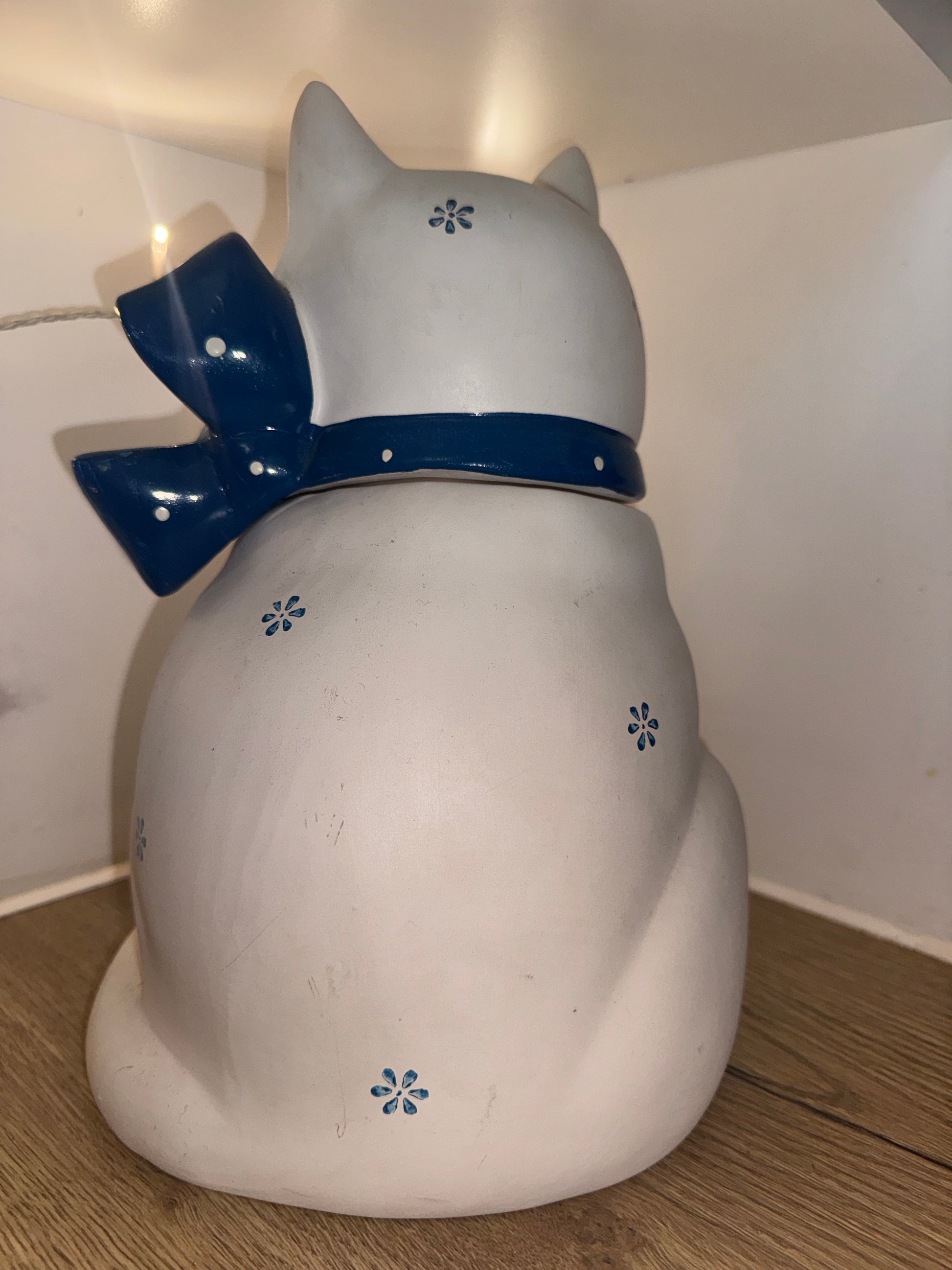 A cute cat cookie jar in great condition. Has a few marks but no major chipping or anything. The head doesn’t sit perfectly, please see photos.