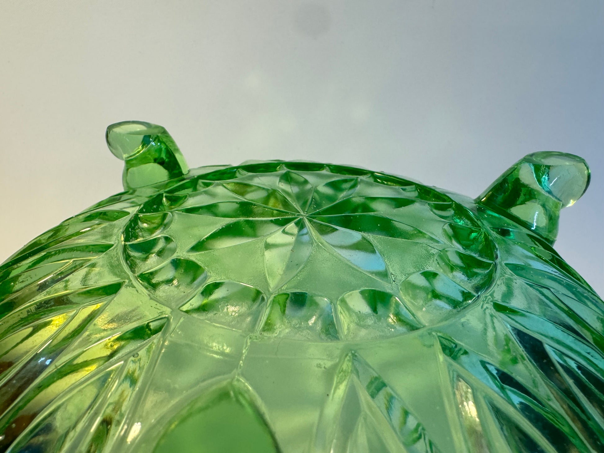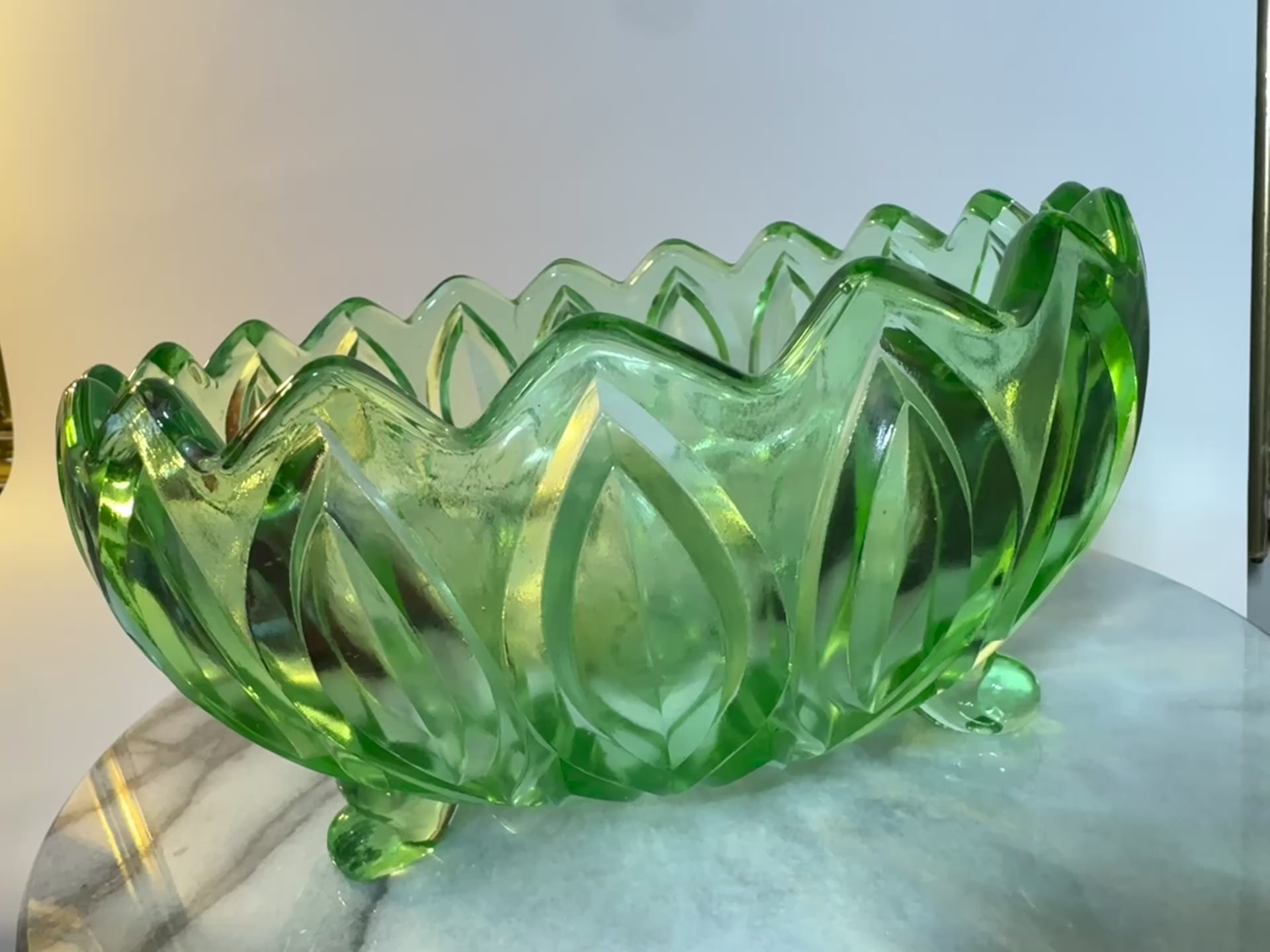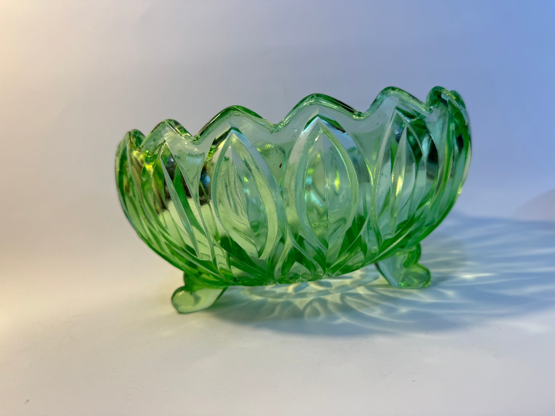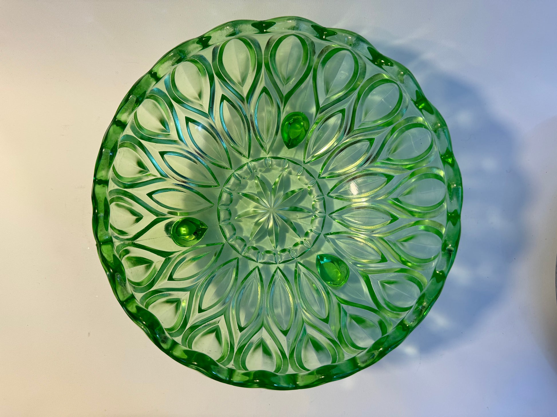 Green Cut Glass Large Bowl | Fruit Bowl | Art Deco | Footed Bowl | Vintage Retro |