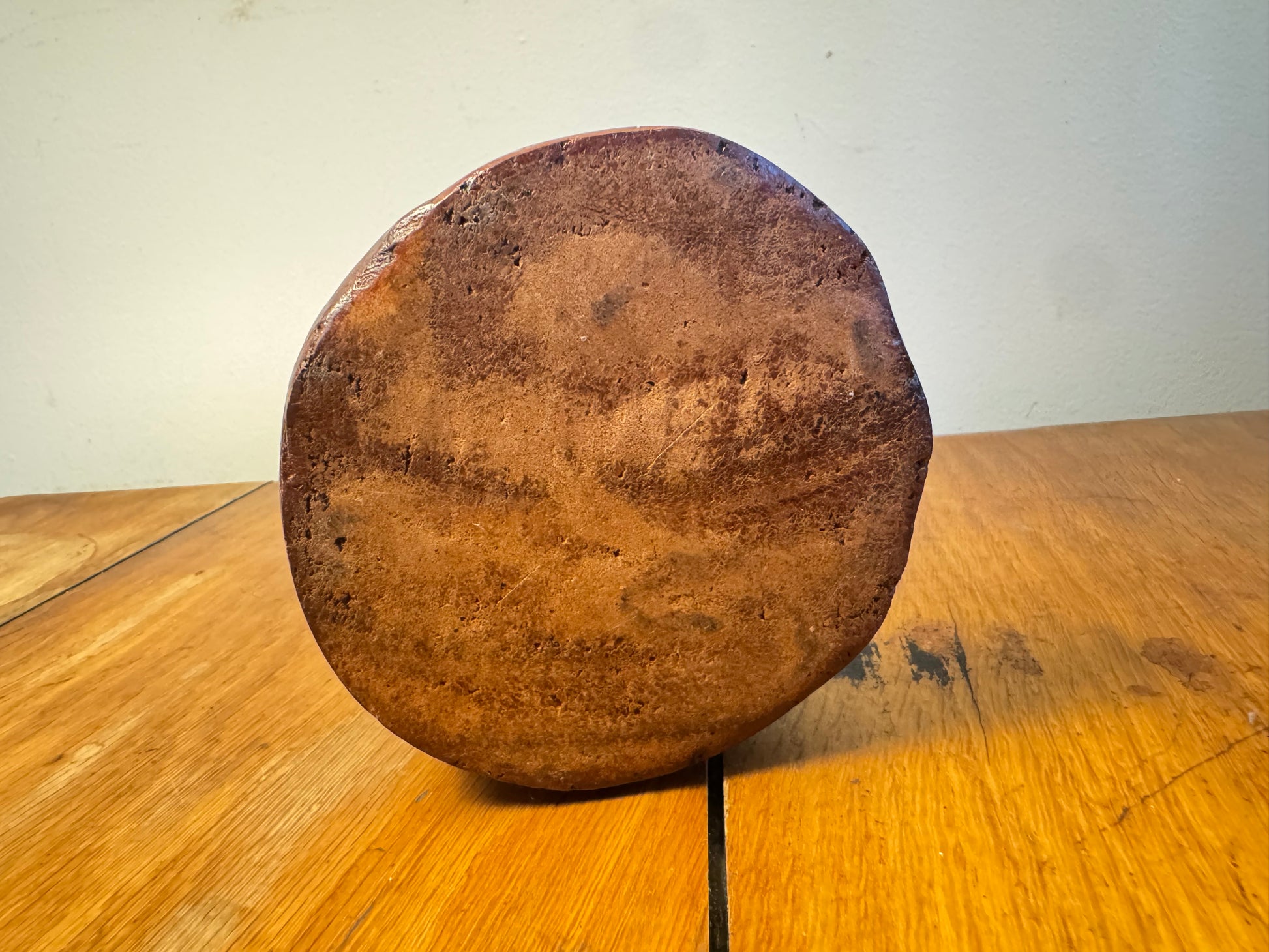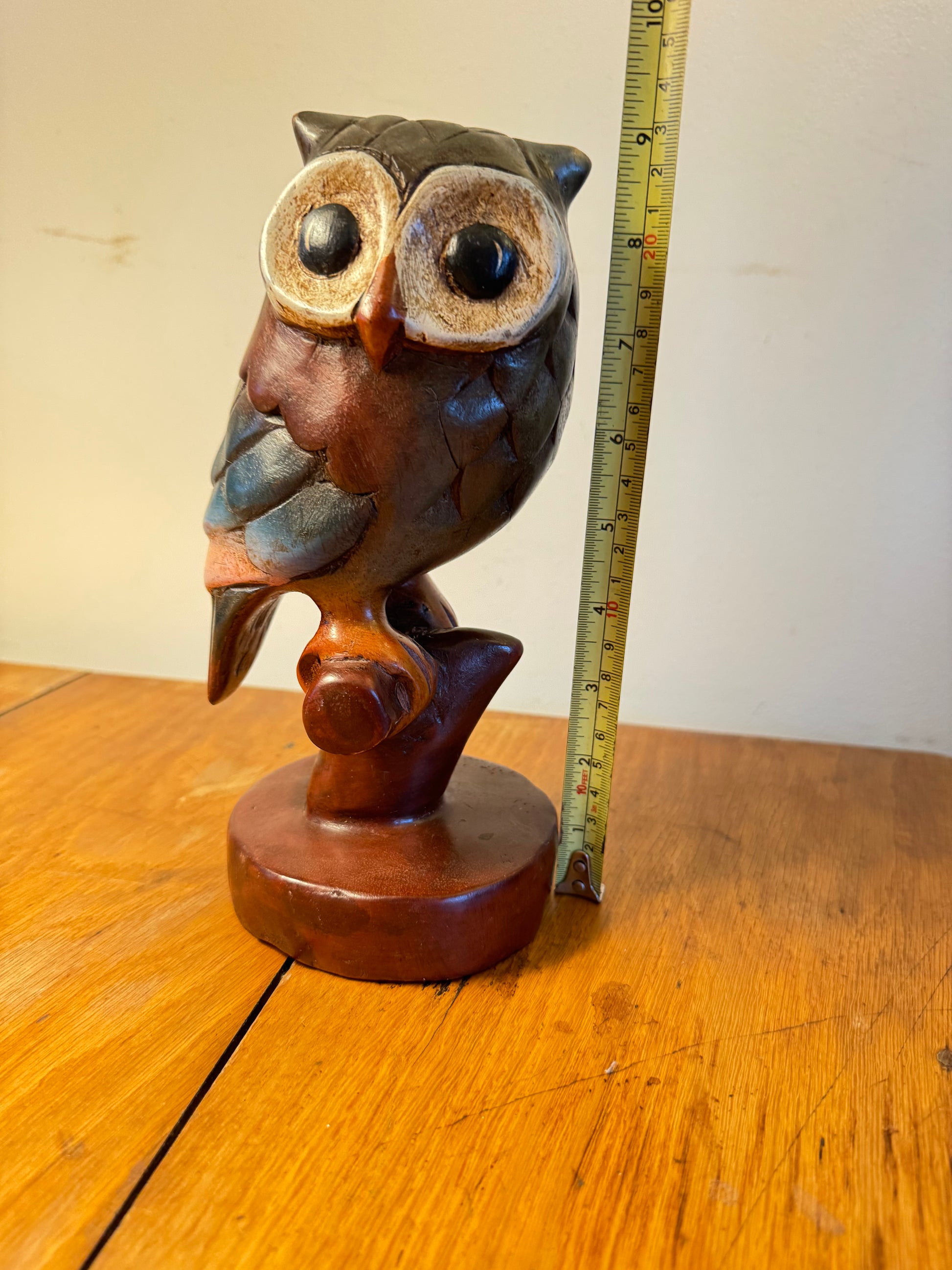 This charming vintage owl sculpture has been hand-carved from solid wood and finished with painted details in warm earthy tones of brown, cream, orange, and blue. With its oversized eyes and perched stance, it brings a quirky yet rustic folk art feel to any room.