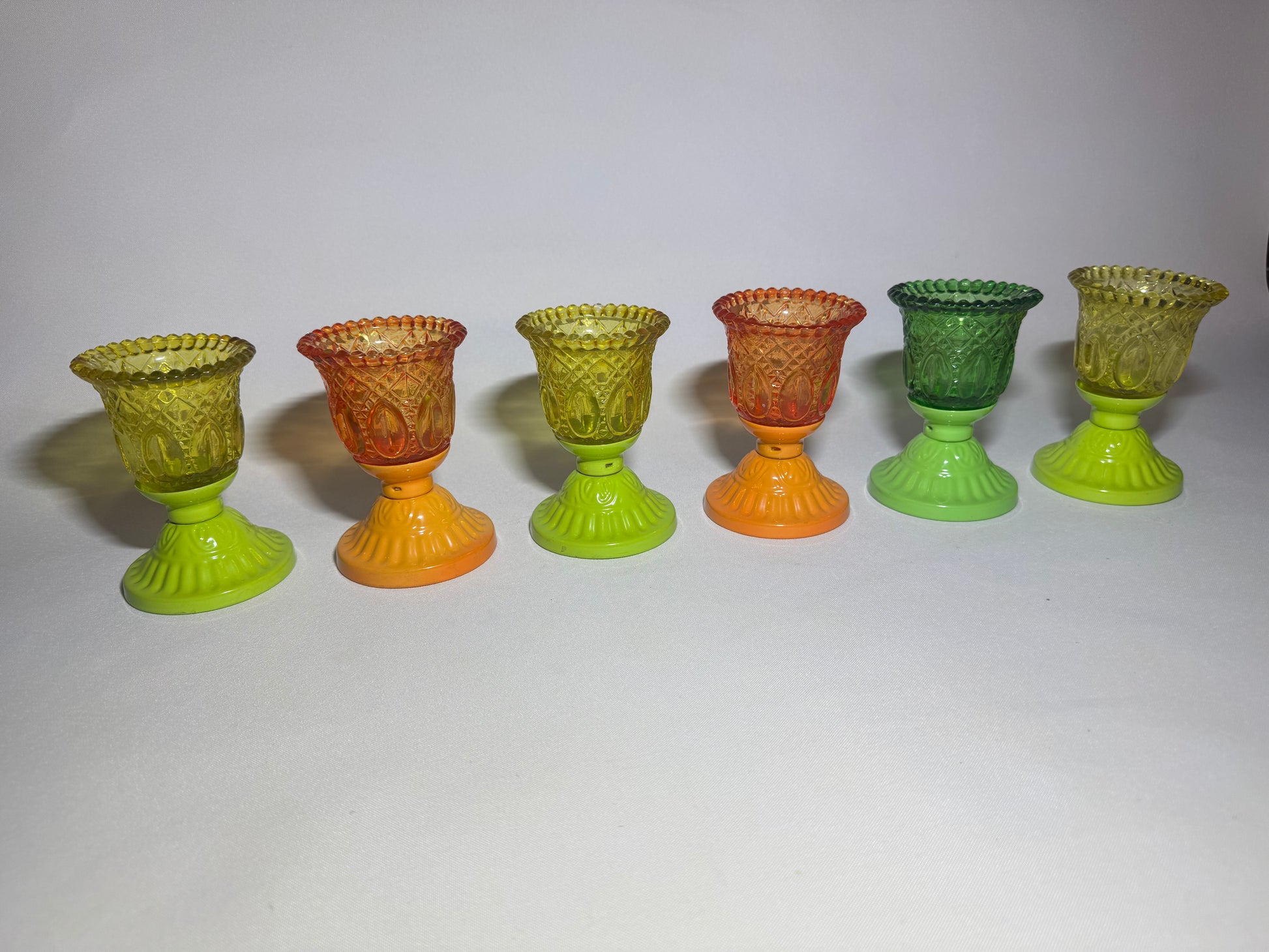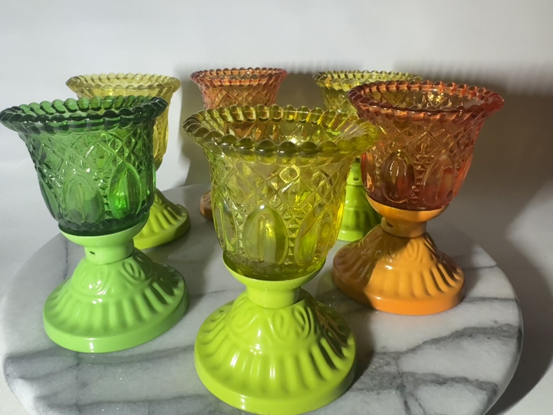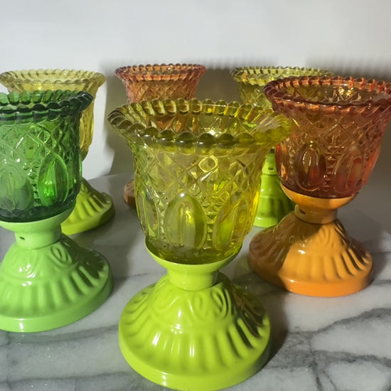 Set of 6 Coloured Pressed Glasses with Metal Base | Tealight Candle Holders |