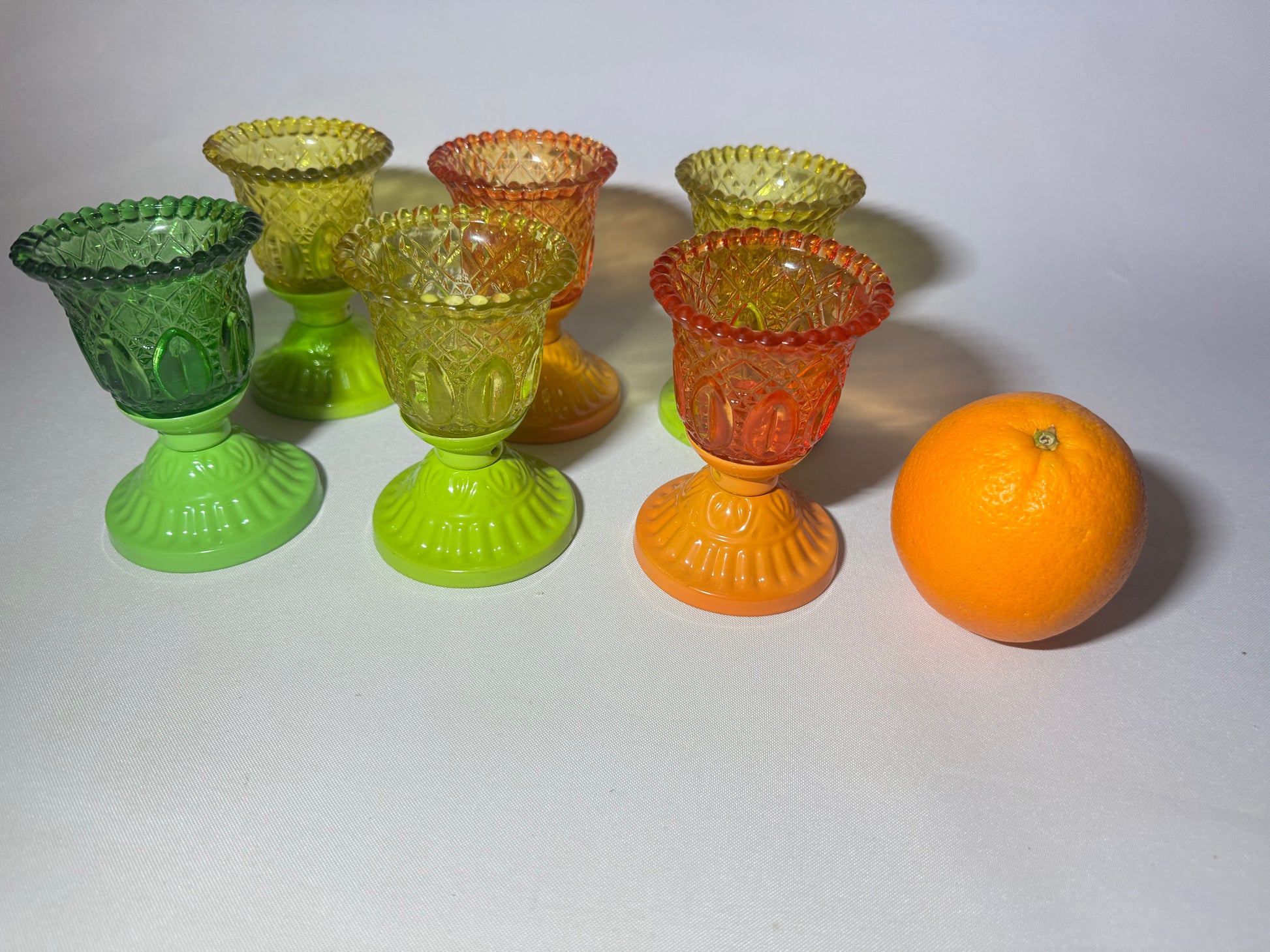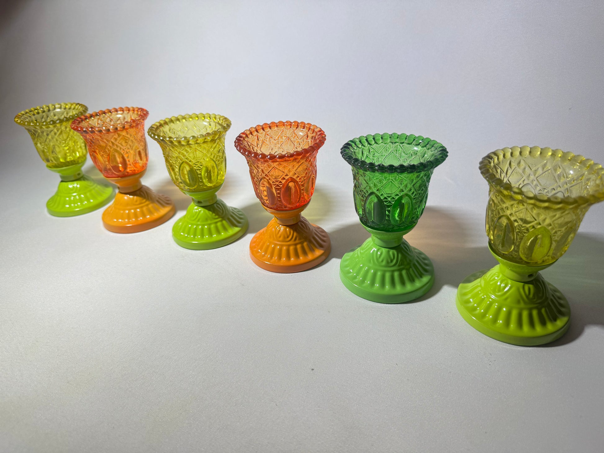 A set of 6 quirky glasses that could be used for liqueur or tealight candles. All in great condition. May show wear, please refer to photos .